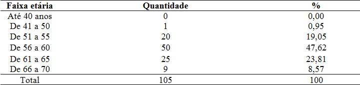 Em relação à faixa etária dos servidores que estão no Abono de Permanência, verificou-se que a maioria está acima dos 56 anos, mas cerca de 20% deles têm até 55 anos. Mesmo assim, apenas 23,81% dos servidores que estão no abono têm entre 61 e 65 anos, e efetivamente os mais idosos não chegam aos 10%. A distribuição da faixa etária ora apresentada se encontra na Tabela 1. Assim, podem ser considerados como profissionais que estão na maturidade de suas carreiras, mas ainda podem trabalhar por muitos anos, antes de decidirem efetivamente pela aposentadoria, que para muitos, é um período que traz perdas pessoais, financeiras e profissionais com muitas resistências a ela, como defendem muitos autores, a exemplo de Soares et al. (2007), Debeti (2011) e Camboim et al. (2011).