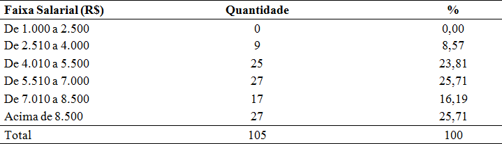 A análise dos dados quanto as faixas salariais dos servidores que estão recebendo o Abono de Permanência mostrou que a maioria recebe acima de R$ 5.510,00 (71%), ou seja, basicamente recebem o teto da previdência pelo INSS no Brasil que é pouco mais de R$5.000,00, em 2016. Salienta-se que cerca de um terço da amostra pesquisada recebe remuneração acima dos R$ 8.500,00 (Tabela 3).