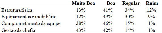 Quanto a análise sobre o ambiente de trabalho na universidade, a maioria dos servidores caracterizou-o como bom e muito bom, em termos de estrutura física, equipamentos, mobiliário, comprometimento da equipe e gestão da chefia imediata. Porém, quase um terço deles reclamou da estrutura física, dos equipamentos e mobiliários, classificando-os como regular. Isto está relacionado aos ambientes diferenciados que existem na universidade e como os respondentes são membros de variadas as unidades acadêmicas, não há uma mesma condição de trabalho para todos.