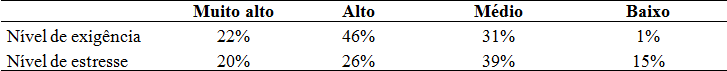 Com relação ao nível de exigência do trabalho realizado na universidade, a maioria dos servidores que está usufruindo do Abono de Permanência apontou como alto ou muito alto (Tabela 6). Isto sugere certo grau de preocupação quanto a este aspecto, uma vez que o nível de stress também foi salientado, embora foram identificadas variações do nível de stress, dependendo do trabalho que é realizado pelo servidor, uma vez que estão vinculados a unidades e funções distintas, como também identificaram Hansen (2005) e Vilela, Garcia e Vieira (2003).