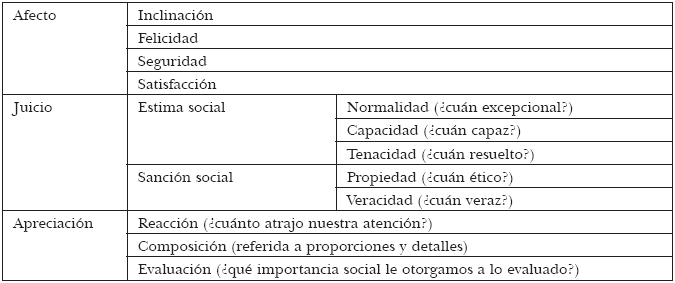 Nos centramos en el subsistema de la actitud, el cual permite dar cuenta de la forma en que se inscriben las subjetividades en los textos. Éste abarca tres regiones semánticas tradicionalmente vinculadas con la emoción, la ética y la estética (Martin y White, 2005: 42): el afecto da cuenta de las emociones positivas y negativas que expresan los actores sociales; el juicio se refiere a las valoraciones sobre los comportamientos de las personas, y la apreciación supone la evaluación de fenómenos naturales y productos sociales.