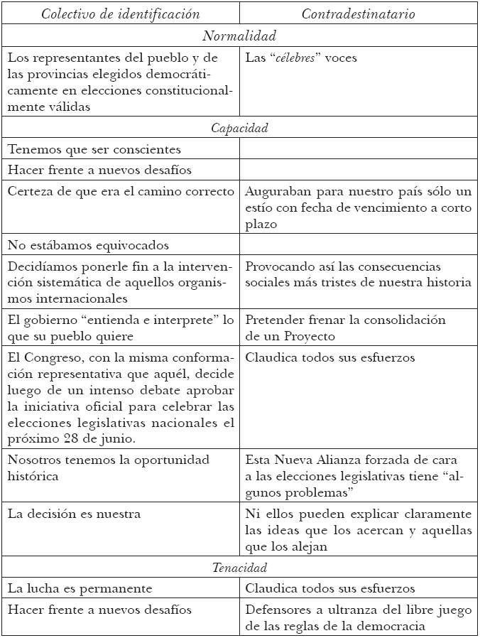 Por otro lado, una lógica de la oposición o del antagonismo, que permite construir discursivamente la identidad propia a través de la confrontación reiterada con distintos enemigos y amenazas. Así, se desarrollan sistemas de valoración que permiten contraponer la capacidad, la tenacidad y la propiedad positiva de los militantes kirchneristas a las evaluaciones negativas del contradestinatario. Respecto del eje de la veracidad, no necesitan explicitarlo para su propia agrupación, puesto que se da por sentada. En cambio, para el contradestinatario, en algunos casos se explicita y en otros se desprende del propio recorrido argumentativo, que muestra las posiciones contradictorias que los políticos desarrollaron a lo largo del tiempo.