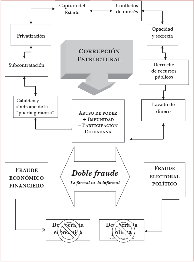 Nuestra teoría del “doble fraude” sostiene que algo parecido ha ocurrido en la política contemporánea. En países de acentuada corrupción estructural como México y otras naciones en transición, la hegemonía de los sistemas de “camarillas” y la dominación informal de poderes fácticos y de grupos de la élite política y financiera han producido una tóxica mezcla entre lo político-electoral y lo estructural-financiero, lo cual ha dado lugar a la génesis y la consolidación precisamente de este sistema de corrupción estructural . Así, en un sistema basado en privilegios mas no en derechos, la competencia electoral termina completamente desvirtuada, abriendo paso al “doble fraude”: un fraude financiero-estructural y un fraude político-electoral . El primero operaría a favor del enriquecimiento de oligarquías y grupos económicos privilegiados, a través de defraudaciones fiscales, manipulaciones bancarias, fraudes inmobiliarios y continuos rescates financieros a costa del erario público. El segundo lo haría a favor del enquistamiento en el poder de los operadores burocráticos, tecnocráticos y judiciales de esas mismas oligarquías y élites financieras vía la compra y coacción del voto, los recurrentes financiamientos ilícitos y criminales en los procesos electorales, el rebase de topes de campaña, las guerras sucias en los medios de comunicación y muchas otras formas de inequidad en las contiendas, para la continua defraudación de la voluntad popular. Esta tóxica interacción, como es evidente, obstaculiza el desarrollo de estructuras estatales justas, limpias, transparentes y democráticas.