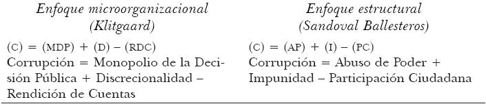 Es precisamente esta corrupción estructural de abuso de poder más impunidad menos participación ciudadana (C = AP+ I - PC), con su red de complicidades y colusiones, la que hoy desvirtúa integralmente a Estado, mercado y sociedad. La lucha efectiva para combatir la corrupción exige mucho más que sacar las “manzanas podridas” de la “canasta social”. Exige observar en su lugar las estructuras, los tejidos y los incentivos intrínsecos a esta misma “canasta” que permiten que la corrupción florezca dentro de ella (Sandoval Ballesteros, 2009).