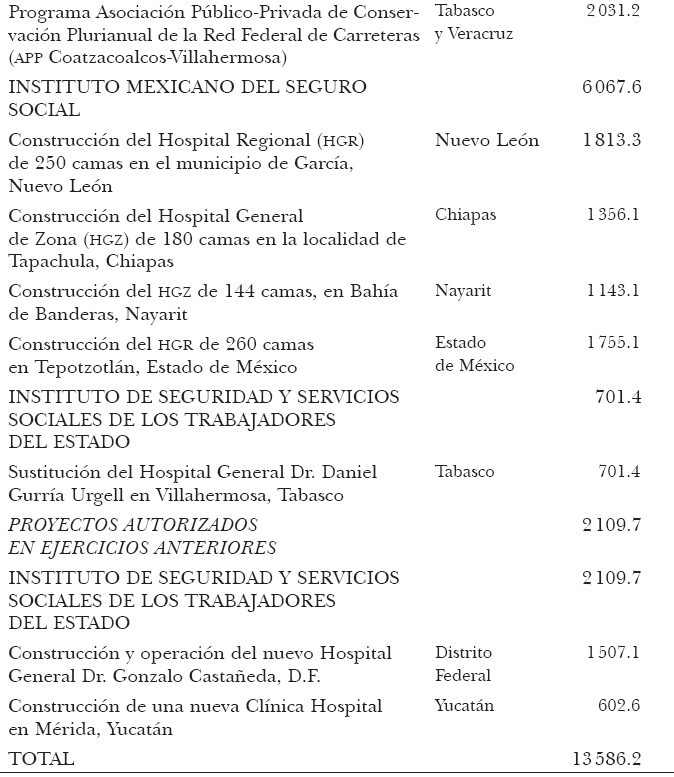 En su proyecto de Presupuesto de Egresos de la Federación para 2016 (PEF), Enrique Peña Nieto ha propuesto fuertes recortes a salud, educación y desarrollo social, a cambio de aumentar los presupuestos para la Secretaría de la Defensa Nacional y la Marina. Asimismo, el PEF de Peña Nieto busca una y total abierta privatización de la salud vía APP que crecerán en más de 100% respecto de las observadas en 2015. En 2015, las APP sumaron más de 1 600 millones de pesos, pero en su PEF para 2016 el presidente ha propuesto decenas de nuevos proyectos que sumarán más de 135 000 millones de pesos (ver tabla 1). Entre ellos destacan cinco nuevos hospitales y otros proyectos que afectarán a la Secretaría de Comunicaciones y Transportes y a los institutos de Salud y de Seguridad Social de algunos de los estados más prósperos y no necesariamente los más necesitados de la República Mexicana.