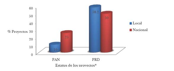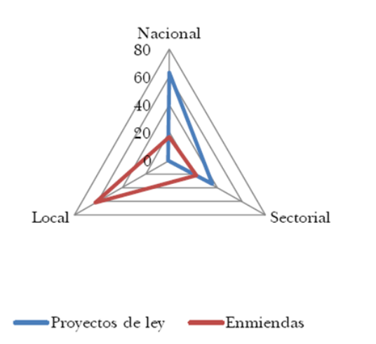 Si se presta atención a la estrategia de iniciación de proyectos sectoriales y locales, se percibe que 58.5% y 66.1% de éstos, respectivamente, fueron llevados a comisión de manera individual. Ello evidencia un comportamiento en la forma de presentar proyectos sectoriales y locales y otro en la de iniciar los nacionales. Es decir, los diputados recurren la mayor parte del tiempo a la vía personal para iniciar política territorial y sectorial, mientras que cuando se trata de un nivel más agregado lo hacen por la vía partidista. Esto puede estar asociado tanto con el éxito posterior de los proyectos nacionales, dado que la acción colectiva aumenta la capacidad de negociación del grupo y disminuye los costos de transacción, como con el deseo de "cultivar una reputación personal" (Béjar, 2012: 634).