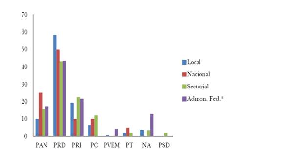 Además del objetivo territorial, en la gráfica 2 destaca que los diputados del PRD realizaron cerca de 50% de las modificaciones al presupuesto. Impulsaron cambios para dotar de recursos de enfoque nacional, así como a ciertos sectores y a la administración pública federal. Destaca, asimismo, que el Partido Acción Nacional (PAN), gobernante, basara sus modificaciones en el ámbito nacional y que el PRI se enfocara, en proporciones similares, a conseguir recursos para determinados sectores y para distintas dependencias del gobierno federal, pasando a un tercer plano el enfoque territorial. Dentro de los partidos pequeños, Convergencia priorizó a los sectores que consideró relevantes para atraer recursos hacia ellos, mientras que Nueva Alianza (NA) primó la obtención de recursos para la administración del gobierno federal.