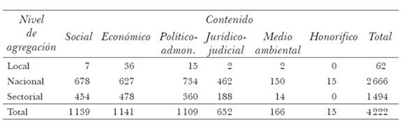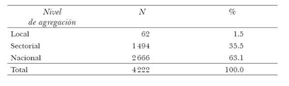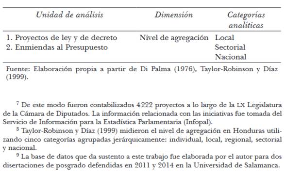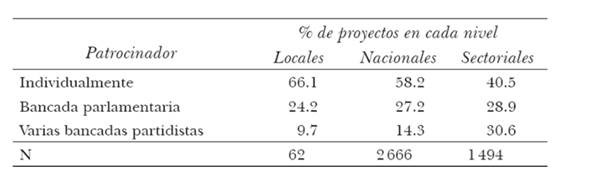 Para identificar el enfoque tanto de los proyectos como de las enmiendas y establecer el objetivo al que estuvieron dirigidos, se optó por clasificarlos según el nivel de agregación adoptando criterios de la tipología que inicialmente propuso Giuseppe Di Palma (1976) y que más tarde rescataron Michelle Taylor-Robinson y Christopher Díaz (1999).8 De modo que los proyectos fueron divididos en tres categorías de la dimensión nivel de agregación: 1) local -cuando estuvieron dirigidos a una municipalidad, ciudad o estado de la federación-; 2) sectorial -si hicieron referencia expresa a un sector de la población, como organismos empresariales, grupos éticos, asociaciones profesionales o partidos políticos-, y 3) nacional -si incluyeron expresa o implícitamente a toda la población o a todos los estados, regiones o municipios (ver tabla 1).9