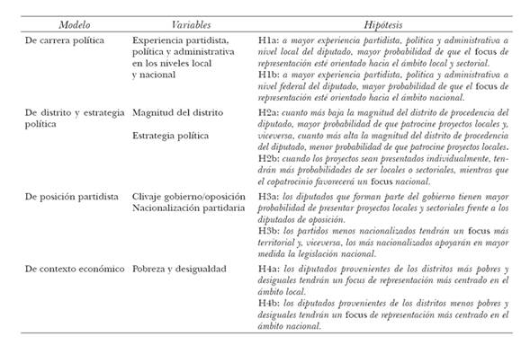 Como es bien sabido, las funciones que desempeñan los congresistas se ven afectadas por una serie de factores asociados con el sistema político y partidista al contexto en el que se desenvuelve su labor parlamentaria y a la experiencia profesional. Una vez descrita la operacionalización de la variable dependiente, este apartado tiene como objetivo delimitar las variables propuestas en la literatura politológica como elementos causales que pueden condicionar el comportamiento legislativo y exponer las principales hipótesis que serán sujetas a contraste empírico en el último apartado. Para una mejor comprensión y bondad en el análisis, las variables predictoras quedaron divididas en los siguientes cuatro modelos: 1) de carrera política; 2) de distrito y estrategia legislativa; 3) de posición partidista, y 4) de contexto socioeconómico.