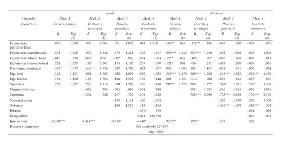 El primer modelo reúne propiedades de la experiencia previa de los diputados. Según John Hibbing (1999), dentro de los estudios dedicados al análisis de la carrera política destaca un grupo que vincula el tipo de representación -en términos de representatividad- con la trayectoria parlamentaria de los congresistas. Considerando que México tiene un sistema federal, las variables aquí agrupadas se dividieron de acuerdo con el nivel de acción política -gubernamental, de tal forma que quedaron, por un lado, los cargos partidistas, administrativos y de elección popular a nivel local, mientras que por otro se reservaron los del ámbito estrictamente federal o nacional- tanto partidista como administrativo.11 La lógica detrás de la carrera profesional es que la experiencia previa del representante a nivel local puede crear "ataduras" con el territorio de procedencia, lo que promovería un mayor desentendimiento de los asuntos generales y mayor atención a las políticas particularistas (Marenghi, 2009: 229).