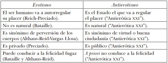 Repasando los conceptos de algunos teóricos o estudiosos del tema, es posible delimitar el binomio erotismo-antierotismo, tomando como base algunas ideas. Sirva el siguiente cuadro para ejemplificar lo que explicaré a continuación: