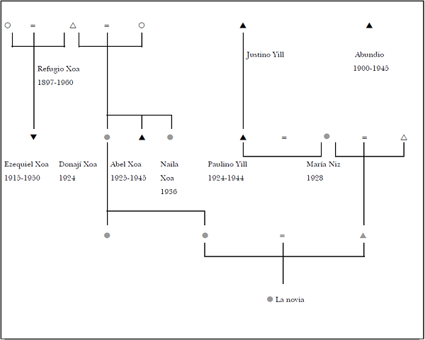 En esa boda conozco a Naila Xoa,2 la tía abuela de la novia, quien me habla sin mayor preámbulo de la trágica muerte de su hermano Abel. Aunque Naila se muestra contenta de bailar al ritmo de la música de banda, al atardecer se despide con prisa y sale a buscar el último taxi que va para Oaxaca, donde ella vive. No quiere quedarse a dormir en el pueblo, en casa de su hermana Donají, la abuela materna de la novia (Cf. genealogía líneas adelante), porque no puede dormir, dice: "Como que hay algo ahí que siempre me acuerdo, pero no son fantasmas". Yo me quedo absorta. Acabo de conocerla hace unas horas y me descubre un antiguo episodio de su historia familiar, del que sus familiares que habitan en el pueblo y que conozco desde hace tres años nunca me habían hablado: un fratricidio cometido contra el hermano menor de Naila, precisamente en la casa donde actualmente vive su hermana Donají.