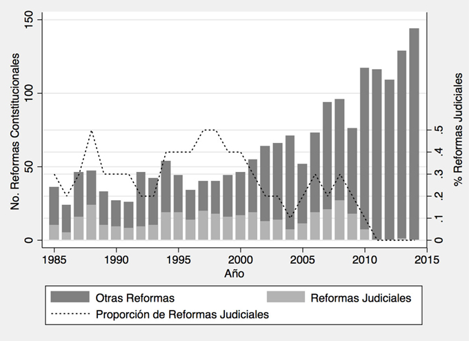 En las democracias latinoamericanas de la tercera ola se han dado una serie de reformas a diversas instituciones de los sistemas nacionales de administración y procuración de justicia (ver, por ejemplo, Brinks, 2005; Hammergren, 2006; Ríos-Figueroa, 2011). Menos estudiadas, pero no menos importantes, son las reformas judiciales que han transformado a nivel subnacional las instituciones judiciales en los países federales de la región: Argentina, Brasil y México (ver, por ejemplo, Castagnola, 2010; Ingram, 2012). No es el caso que todas las reformas apuntan sin ambigüedad al incremento y consolidación del poder judicial (Brinks y Blass, 2013), y esta variación impone diversas preguntas: ¿por qué en algunos casos los políticos que ocupan posiciones en los poderes ejecutivo y legislativo reforman las constituciones para dar independencia a los jueces?; ¿cuándo y por qué optan por dejar de controlar al poder judicial, con el riesgo de que esta decisión les imponga costos en el futuro?; ¿por qué, en general, los políticos hacen reformas constitucionales que pueden implicar una pérdida en el poder que ostentan?