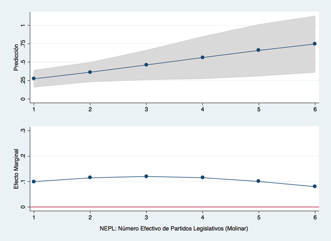 Para simplificar la interpretación de resultados, transformamos la variable categórica dependiente en una variable dicotómica donde 0 captura las categorías más bajas del índice (1, 2 y 3) y 1 las más altas (4, 5 y 6). Realizamos un modelo probit (ver tabla 4, modelo 13) y, comparando con el probit ordenado anterior, vemos que al transformar la variable categórica en dicotómica se conservan los efectos significativos de NEPL e ideología pero la variable gobierno dividido pierde significancia estadística. La parte superior de la figura 4 muestra las predicciones de probabilidades de la variable NEPL con base en este nuevo modelo con variable dependiente categórica: las legislaturas con dos partidos representativos tienen probabilidades menores a 0.4 de tener una calificación mayor a 4 en el índice de independencia, mientras que las legislaturas con al menos tres partidos de igual magnitud tienen probabilidad superior a 0.5 de tener una calificación superior a 4 en el índice. La parte inferior de la figura 4 muestra que, a partir de tres partidos, en la medida que se incorpora otro partido, el efecto marginal en la variable dependiente disminuye (el cálculo de las probabilidades y efectos marginales proviene del modelo probit antes mencionado).