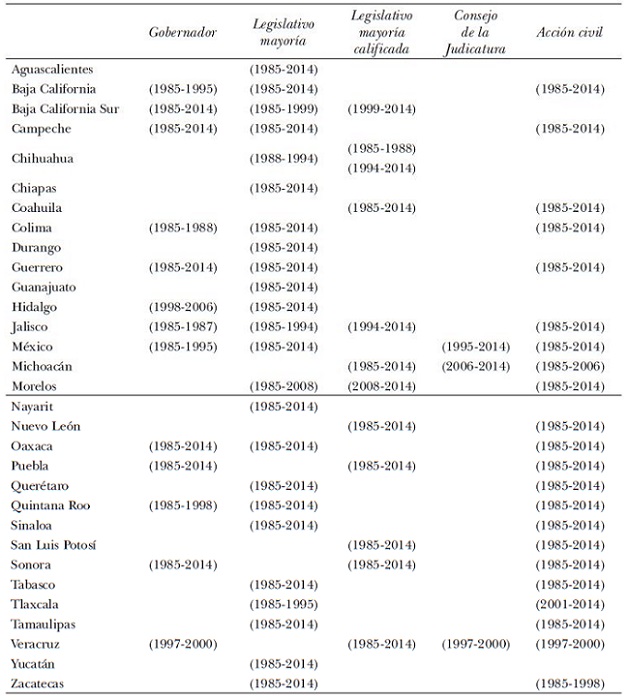 En las constituciones estatales de México se hace referencia a distintos actores que pueden presentar una acusación contra los magistrados: el gobernador, la legislatura (mayoría o mayoría relativa), el CJ y la sociedad civil (con ciertos requerimientos para que ésta proceda). La tabla 1 (páginas 296-297) presenta los años y los actores que pueden iniciar el proceso de remoción en cada estado para el periodo 1985-2014. Lo más notable es la primera columna, que muestra los estados y el periodo en que el gobernador tiene la facultad de solicitar unilateralmente la remoción de un magistrado por “mala conducta”.13 La tabla también muestra que, a diferencia de los procesos de nombramiento, los mecanismos de remoción de magistrados presentan menos variación a través del tiempo. En los pocos estados que han implantado reformas en esta materia se observa una tendencia a disminuir el grado de discrecionalidad que pueden tener los actores durante el proceso.