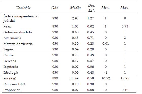Independencia Judicial (i, t) = ß0+ ß1“Competencia Electoral” (i, t) + ß2Seguro (i, t) + ß3Ideología (i, t) + ß4Crecimiento Económico (i, t) + ß5Reforma 1994 (i, t) + &. Donde i representa la observación de cada estado y t representa el año del periodo 1985-2014. El periodo de estudio abarca 30 años (1985-2014) de los 31 estados de México, lo que genera una serie de datos panel con 930 observaciones, donde la unidad de análisis es estado-año. La tabla 2 presenta la estadística descriptiva de las variables que incluimos en el análisis. Las características de la variable dependiente y la estructura de los datos sugieren utilizar un modelo probabilístico para la mejor estimación e interpretación de resultados. En concreto, para evaluar las hipótesis usamos un modelo probit ordenado con errores estándar robustos para controlar la heteroscedasticidad entre clusters (consideramos a cada estado como un cluster).