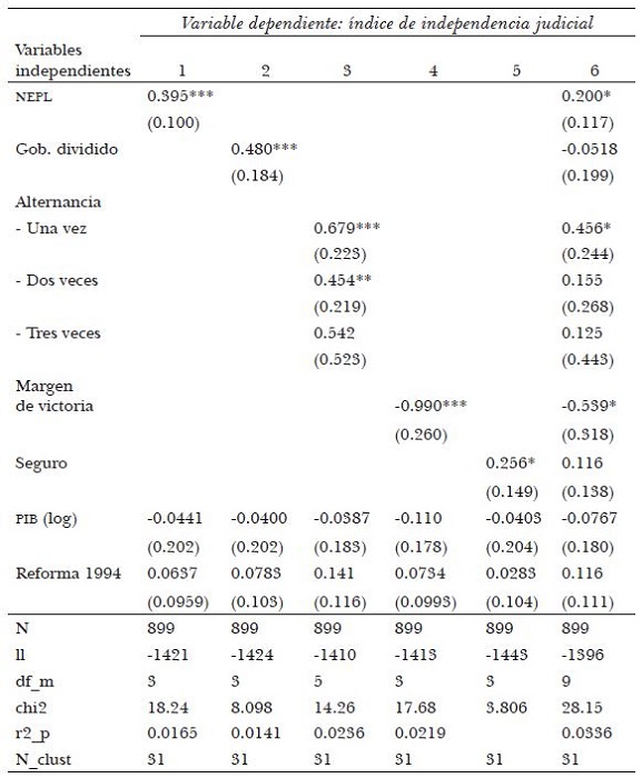 En general, encontramos evidencia de que la competencia política tiene un efecto positivo en la probabilidad de creación de reformas constitucionales que hagan más independientes a los magistrados de los tribunales superiores de justicia en los estados de México. Encontramos que el NEPL, gobierno dividido, el número de veces que hay alternancia en un estado, y el margen de victoria entre candidatos a gobernador tienen el efecto esperado cuando se evalúa su relación directa con el índice de independencia judicial. Sin embargo, cuando evaluamos todas estas medidas simultáneamente, el resultado más consistente es que el NEPL tiene un efecto positivo y significativo, mientras que las otras medidas unas veces mantienen y otras pierden la importancia estadística.