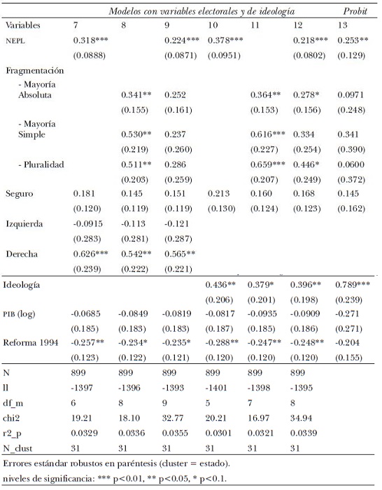 Creemos que estos resultados son interesantes tanto empírica como teóricamente: ¿exactamente por qué y en qué es más (o menos) importante la alternancia que el margen de victoria y el gobierno dividido? ¿Qué efectos tienen estas distintas expresiones de la competencia política en las percepciones y los incentivos de los políticos? Si el NEPL es lo que tiene un efecto más consistente, ¿habría entonces que buscar reformas que lo aumenten?, por ejemplo, ¿reformas electorales que favorezcan la representación proporcional? Estas preguntas, que han sido relativamente poco exploradas, quedan para investigaciones futuras; nuestro artículo motiva a pensar que vale la pena examinarlas.28