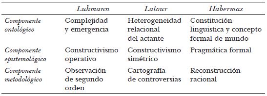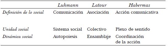 A continuación caracterizaremos de manera simplificada y esquemática las teorías de Luhmann, Latour y Habermas como programas de investigación. Dentro del contexto disciplinario de los años setenta y ochenta, éstas elaboraron construcciones alternativas del objeto disciplinario mediante la diferenciación de un fundamento operativo con un doble esquema de elementos básicos y red, vinculado mediante relaciones explanans-explanandum con elementos dinámicos y mediante estatutos sociológicos con elementos performativos. La arquitectura multinivelada básica y la constitución por doble diferenciación se describen en cada caso así.