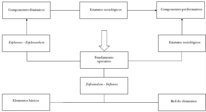 En cuanto al primero, Aldo Mascareño (2008a: 222) señaló que un fundamento operativo posee tres componentes básicos: ontológico, epistemológico y metodológico. El primero articula de manera dinámica y sintetiza las elaboraciones conceptuales que establecen los supuestos relativos a la estructuración de lo real para el programa; el componente epistemológico establece los supuestos relativos al planteo cognitivo, y el metodológico, los supuestos de la lógica de la investigación.