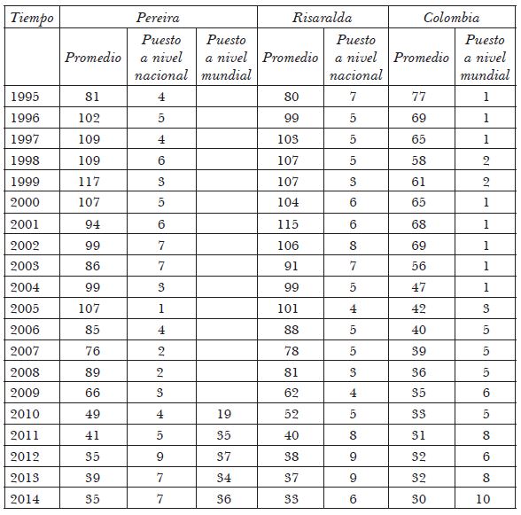 Los datos recopilados en el estudio que sustenta el presente artículo permitieron reconocer las estrechas relaciones entre expresiones de violencia homicida y algunos mercados criminales que operan en Pereira y su área metropolitana. Al respecto, si se revisa el incremento en la tasa de homicidios a nivel local y regional en los últimos 20 años, se puede reconocer en términos tendenciales un decrecimiento en la tasa de homicidios a nivel local y regional,l pero si se analizan las cifras de la tendencia nacional (lugar que ocupa Pereira respecto a las 32 ciudades capitales colombianas y Risaralda respecto a los 32 departamentos), se identifican lógicas de violencia que ubican a Pereira en el primer lugar respecto a su tasa de homicidios en 2005, el segundo lugar en 2007 y 2008, y tercer lugar en 2009 (cuadro 1, en la siguiente página).