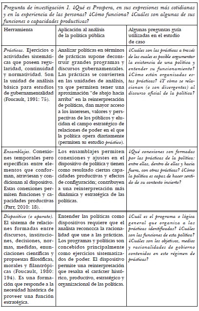 Para facilitar el entendimiento del enfoque y sus herramientas, se presentan a continuación tres cuadros que simbolizan las dimensiones de análisis, con sus respectivas preguntas de investigación para el caso de Prospera, y que identifican las herramientas utilizadas y describen su utilidad esperada en este estudio.