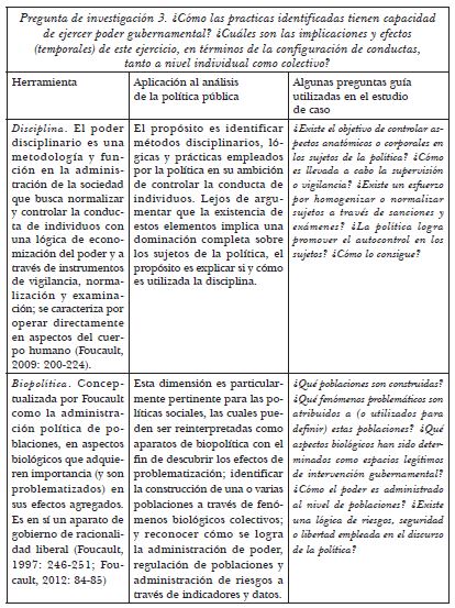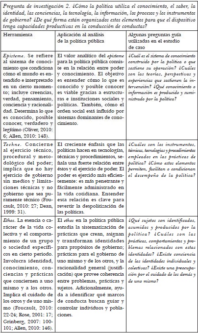 Respecto a cómo estudiar políticas públicas con un enfoque de gubernamentalidad, este artículo sugiere seguir una lógica de “caja de herramientas” (Rose, O’Malley y Valverde, 2006: 83-104), empleándolas en el estudio de casos concretos. Si bien existen debates que defienden o niegan el valor analítico de la gubernamentalidad, es suficiente decir que este artículo permite juzgar el valor de la investigación empírica a través de sus métodos y resultados. Asimismo, y atendiendo la preocupación de Foucault y otros autores sobre perder mérito analítico al sistematizar el enfoque, el objetivo de esta investigación es aventurar una derivación y una aplicación prácticas que funcionen para traer la discusión de métodos y herramientas al terreno principal del análisis de políticas, sin por esto pretender ofrecer un conjunto de reflexiones preformuladas o un sistema teórico autocontenido (Walters, 2012: 5). Es decir, del pensamiento foucaultiano se toman prestados lentes críticos que, en casos particulares, permiten resaltar ciertas lógicas, formas y efectos del ejercicio del poder político.