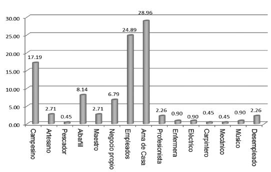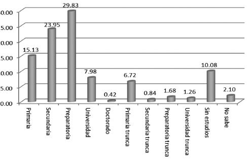 Existe un cambio en los porcentajes de estudios de la población actual con respecto a sus propios padres (Gráfica 3). Un mayor porcentaje de la juventud sabe leer y escribir, y el nivel de estudios con respecto a sus padres llega hasta la secundaria y preparatoria, lo que les permite trabajar en actividades como secretarias o vendedoras en tiendas comerciales en Villahermosa. Sin embargo, los niveles de ingreso económico no parecen mejorar en mucho en cuanto a la calidad de vida que tuvieron sus padres.