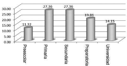 Las escuelas de la comunidad son dos preescolares y una primaria. Los jóvenes se desplazan a la cabecera municipal para estudiar la secundaria y el bachillerato. Alrededor de 25% de ellos estudia el nivel superior; el resto suspende los estudios para apoyar a su familia en los camellones o parcelas. En su mayoría, los jóvenes estudian hasta el nivel de secundaria. Es en esta etapa en la que gran parte de las mujeres de la comunidad regresan para apoyar a sus familias, mientras que los hombres continúan estudiando. En el nivel medio superior, los jóvenes de la comunidad viajan a Nacajuca para estudiar en el colegio de bachilleres; en esta etapa, tanto hombres como mujeres dejan los estudios (Gráfica 2), para apoyar al padre de familia en los camellones, o viajan a Villahermosa para trabajar como albañiles y llevar dinero extra a su hogar. Los hombres jóvenes migran temporalmente de la comunidad para vender su fuerza de trabajo como albañiles, lo que antes hacían los hombres de la comunidad que salían a los cañales para vender su trabajo y llevar ingresos económicos a sus hogares.