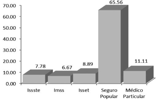 El 65.56% tiene como seguro médico el llamado Seguro Popular, lo que indica que no tienen un empleo formal. Es obligación de la empresa dotar a los trabajadores del seguro de gobierno. En ocasiones, cuando los pacientes perciben que el centro de salud de la comunidad no responde a sus necesidades o la enfermedad requiere atención inmediata, acuden a la visita de médicos que atienden en las farmacias de similares o de farmacias Unión, que en los últimos años han proliferado en todo el país y cuyos médicos cobran entre 15 y 20 pesos la consulta.