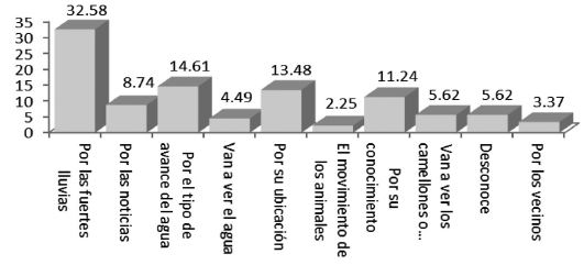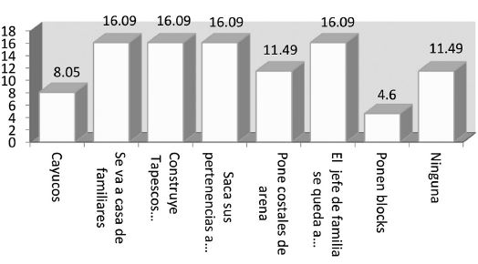 La inundación que más recuerda la población es la de 2007, que causó grandes problemas: se perdieron las cosechas, faltaron bancos de peces, debido al agua contaminada, y los estancamientos dieron lugar al aumento de morbilidad por hongos en la piel y al incremento de enfermedades respiratorias. De aquel desastre la mayoría no ha podido recuperarse; los que sí lo han hecho ha sido con un esfuerzo extenuante, mediante préstamos y trabajando horas extras para poder adquirir los bienes materiales perdidos y pagar la deuda que adquirieron. Ante esta situación, la población difunde a los jóvenes su experiencia sobre el conocimiento de los ciclos anuales del agua e intenta enseñarles a sus hijos a nadar y a no confiarse. Otra acción de la población es observar cómo va avanzando el agua por las diferentes áreas en las que saben que si el nivel del agua sube, es posible que entre a la comunidad. En la Gráfica 6 se muestran las estrategias de la población para enfrentar amenazas de inundación.