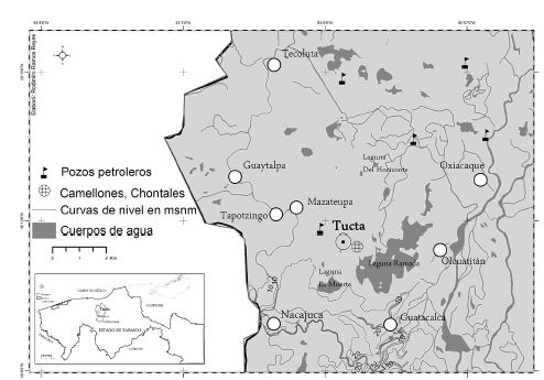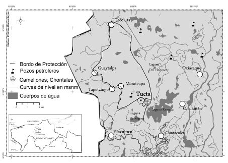 La región hidrológica del Grijalva está integrada por tres subcuencas: alta, media y baja (García, 2010). Tucta forma parte de lo que se conoce como la Olla de la Chontalpa, donde, de acuerdo con un mapa realizado en 1955 por la extinta Secretaría de Recursos Hidráulicos, se muestra toda una amplia región integrada por los municipios de Nacajuca, Jalpa de Méndez y Cunduacán, que se anegaban con frecuencia. Para Elías Balcázar (2003: 66-67), la Olla de la Chontalpa es más conocida como la vieja Chontalpa y quizá es la región más baja e inundable en Tabasco, la cual sufrió una decadencia progresiva que inició desde la etapa virreinal, continuó con la invasión de piratas, los rompidos y el desbordamiento del Mezcalapa, aunque tiempo atrás había sido la más próspera y poblada del estado.