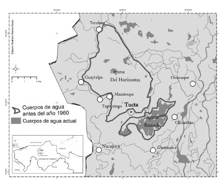 Algunos varones entrevistados coinciden en que, en la década de 1950-1960, las dimensiones de la laguna El Horizonte y La Enramada eran mucho mayores que en la actualidad, de tal manera que con sus cayucos podían llegar a Tecoluta y a todas las comunidades de los alrededores. Las variaciones se debieron a los cambios hidrológicos de la CRG y a los rellenos que hizo Pemex cuando construyó sus pozos petroleros muy cerca de las comunidades, especialmente las ubicadas en la laguna El Horizonte. En los Mapas 2 y 3 se puede observar y comparar el cambio de paisaje local de Tucta y alrededores en 1960 y en la actualidad.
