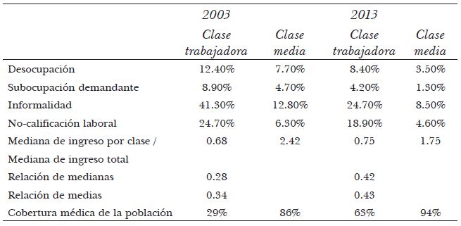 Al observar la distribución de los indicadores laborales en la Tabla 1, reparamos en que, si bien la desocupación y la sub-ocupación han descendido fuertemente en el periodo 2003-2013 (Neffa, Oliveri y Persia, 2010; Kessler, 2014), la tendencia a que estos problemas afecten mucho más a hogares de clase trabajadora que a hogares de clase media se ha mantenido, o incluso profundizado.
