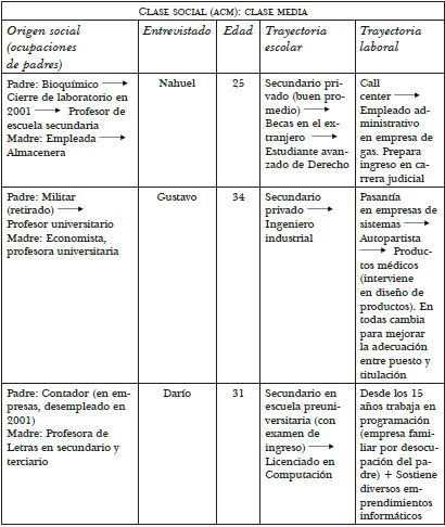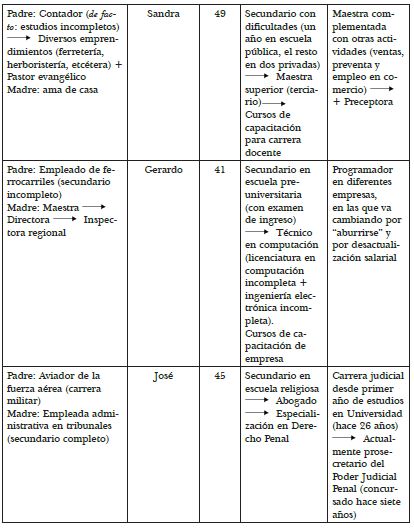 Las trayectorias de clase en este grupo se apoyan fuertemente en el capital cultural institucionalizado; casi todos los padres son profesionales (arquitectos, contadores, bioquímicos, etcétera) con carreras universitarias completas o casi finalizadas. En otros casos, se trata de empleados con inserciones en organizaciones que han supuesto “carreras de empresa” (Muñiz Terra, 2013): ferrocarriles, policía federal, fuerzas armadas, etcétera, en diferentes esferas de la burocracia estatal. Paralelamente, en esta clase, todas las madres de entrevistados han participado del mercado laboral con relativa continuidad. Algunas se han insertado como profesionales o técnicas (maestra, vicedirectora y directora de escuela; profesora de secundario y universidad) y otras como empleadas administrativas (en laboratorios, municipalidades, tribunales o empresas familiares). Sólo una de las madres de los entrevistados se desempeñó exclusivamente como ama de casa. Esto se corresponde, a grandes rasgos, con los patrones de trabajo femenino señalados por Susana Torrado (2003) para los estratos medios asalariados: niveles altos de participación laboral -respecto de los demás estratos, excepto del marginal-; mayor actividad entre los años previos a la reproducción (25-29 años), descenso a partir de los 30, para recuperar a partir de los 35 años; una incorporación más tardía de jóvenes y adolescentes al mercado laboral, etcétera. En conjunto, estimamos que las inserciones de los padres han propiciado en las familias de los entrevistados apuestas sostenidas de acumulación de capital cultural en los hijos, así como la búsqueda de posicionamientos que proporcionen estabilidad y cierta satisfacción con el trabajo.