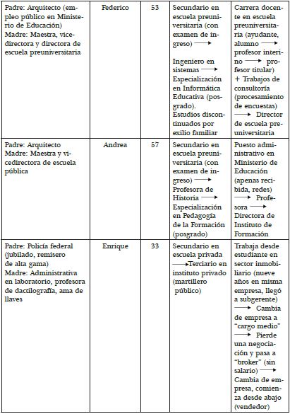Los miembros de la clase media que hemos explorado asientan sus inserciones laborales en acumulaciones de certificados escolares, en coincidencia con lo que señalan otras investigaciones sobre estos sectores (Dalle, 2010; Benza, 2014). Ahora bien, las vías para hacer valer estas titulaciones en el ámbito laboral pueden transitarse por carreras burocráticas, en empresas privadas o en emprendimientos personales o familiares. Así, una primera diferencia en el tipo de trayectorias en el interior de la clase se relaciona con las carreras: unas más meritocráticas, ligadas con la lógica burocrática (propias de tareas en el sector público, tal como aparece en nuestro análisis estadístico asociado a esta posición de clase, en ramas de salud, educación y gestión jurídico-administrativa), y otras que requieren la titulación de un modo más instrumental (por ejemplo, un martillero público en el mercado inmobiliario). La validación de las titulaciones en cada caso requiere del capital cultural institucionalizado, pero en las primeras demanda una constante inversión -que suele terminar cuando se logran posiciones consolidadas-, en tanto que entre las segundas un título terciario parece ser satisfactorio.12