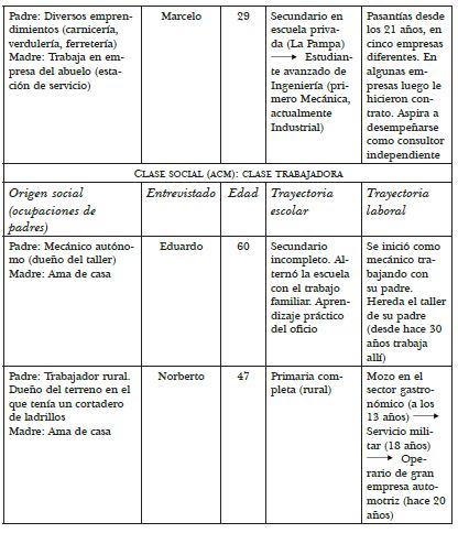 A continuación, realizamos el análisis de las trayectorias de los entrevistados, centrándonos en los referentes de hogar seleccionados para el estudio, aunque puestos en relación con los recorridos de cónyuges, antecesores y sucesores. En el Cuadro 1 (a partir de la siguiente página) se aprecian de un modo más completo las trayectorias escolar y laboral analizadas para los miembros de las dos clases.