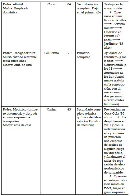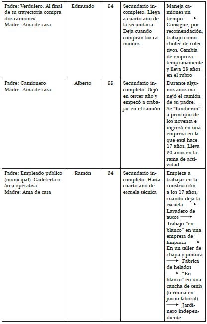 Las trayectorias laborales de los varones de clase trabajadora presentan algunas importantes características en común. Todos se insertaron de manera temprana (y por intermediación familiar) en el mercado de trabajo, entre los 10 y los 15 años. Permanecen en las mismas ocupaciones (mecánico, trabajador de la construcción, operario de fábrica o chofer de autobuses y camiones) por entre 20 y 45 años.