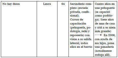 No obstante, en algún caso la actividad complementaria se convierte (percibida por los mismos agentes) en suplementaria: supeditada a generar “condiciones de posibilidad” para la actividad laboral del varón, para fomentar iniciativas de autoempleo. En sus propios relatos, las mujeres de estas familias explican sus ocupaciones motivadas por “ayudar” a sus maridos, o para “permitir” (brindando ingresos fijos a través de un salario) que ellos puedan insertarse plenamente en ocupaciones como cuentapropistas.