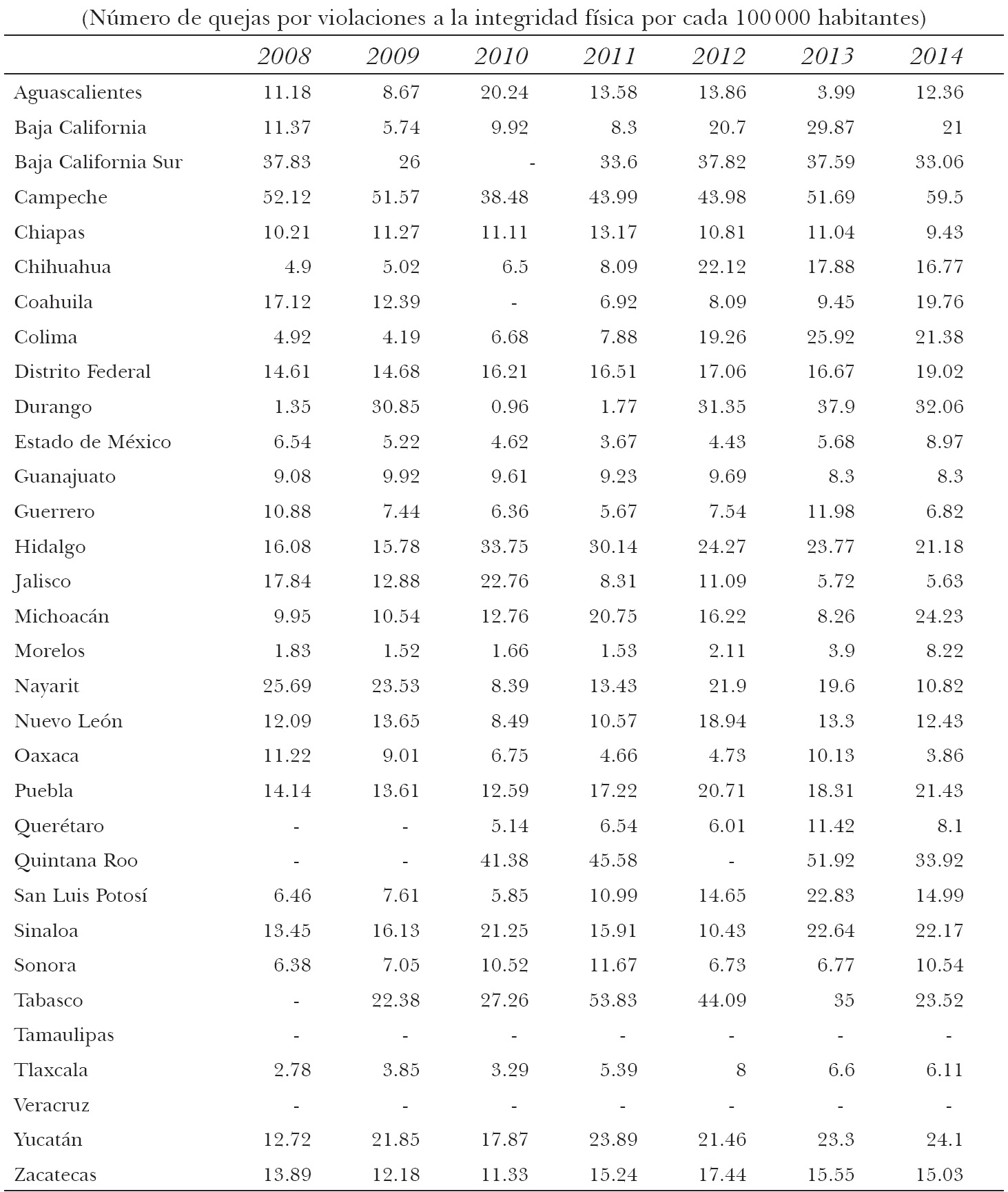La mejor opción disponible fue actualizar el trabajo de Caroline Beer y Neil Mitchell (2004), centrando la atención en las violaciones a los artículos 3 a 9 de la Declaración Universal de Derechos Humanos: derecho a la vida, derecho a la libertad y seguridad de la persona, derecho a no ser torturado o castigado degradantemente, derecho a no ser arrestado arbitrariamente. Ellos midieron la violencia estatal mediante el número de quejas interpuestas ante la Comisión Nacional de Derechos Humanos (CNDH) por entidad federativa. Podría argumentarse que las quejas no son indicadores fiables porque las autoridades pertinentes todavía no evalúan el caso, pero ese razonamiento no considera que los ombudsman rara vez emiten recomendaciones -por ejemplo, la CNDH convierte sólo 1% de las quejas- porque no son instrumentos jurídicamente vinculantes y la mayor parte de su castigo es presión política, utilizada sólo en casos extremos (Magaloni y Elizondo, 2014).