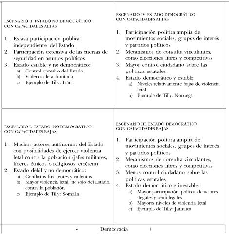 Por su parte, el grupo democrático difiere más en el tipo que en el número de actores, porque la democracia presupone una pluralidad de participantes en la contienda política. Así, el escenario IV es menos violento que el III porque el Estado limita la participación de actores legales y semilegales en los asuntos públicos y los ciudadanos cuentan con mecanismos de control sobre las autoridades más allá del ámbito electoral. Es decir, el escenario IV combina las bondades del régimen democrático y mayores capacidades estatales, mientras que el III plasma las dificultades que enfrenta un Estado que no es capaz de hacer valer la legalidad ni permite que sus ciudadanos tengan mecanismos de control no electoral sobre sus autoridades.