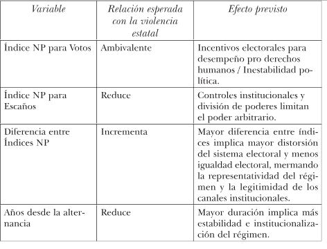 Siguiendo este camino, la investigación se concentró en la dimensión electoral de la democracia, separándola en tres momentos: la emisión del voto, el sistema electoral y la distribución del poder público. Cada uno tiene efectos distintos sobre la violencia estatal, aunque considero que, en conjunto, la democratización debería disminuirla. Por un lado, las aproximaciones teóricas encuentran valor intrínseco en las elecciones para disminuir las violaciones a la integridad física porque implican aceptación ciudadana de los canales institucionales y logran expresar y articular el disenso, así como proveer límites institucionales para la conducta aceptada, según David Richards y Ronald Gelleny (2007). Teóricamente, esto derivaría en menos protestas y menos represión, una de las modalidades de la violencia estatal, como se discutió líneas arriba.