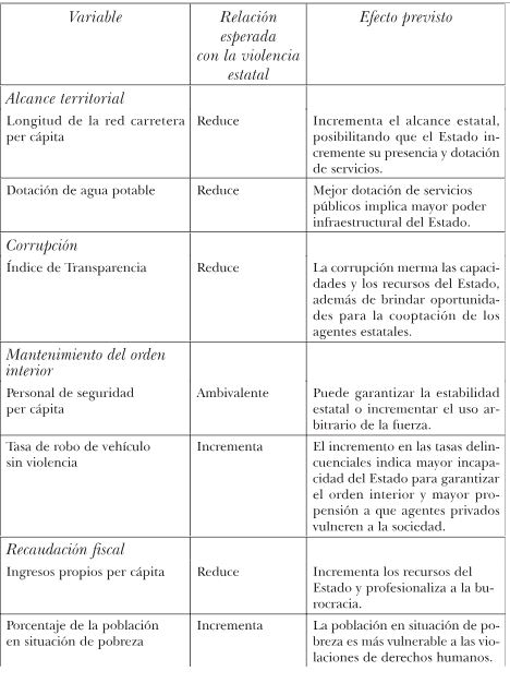 Charles Tilly (2007) combina la proposición democrática y las capacidades estatales.5 Señala que su relación no es lineal, pues son procesos autorreforzantes a largo plazo pero, en las etapas tempranas, sus dinámicas no son del todo convergentes: la expansión estatal genera resistencias de la sociedad, mientras la democratización incrementa las demandas de los ciudadanos. Tilly advierte que los Estados se dirigirán hacia el autoritarismo si la expansión de capacidades es más rápida que la democratización, o tenderán a la inestabilidad si la democratización es más rápida que el incremento de las capacidades. Con esto en mente, la respuesta tentativa que orientó a la investigación fue que la democratización electoral no disminuye la violencia estatal, mientras que el incremento de las capacidades estatales sí lo logra.