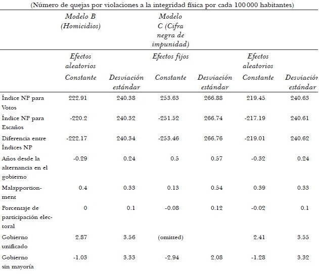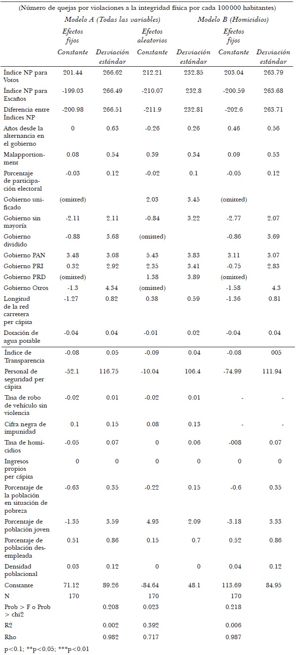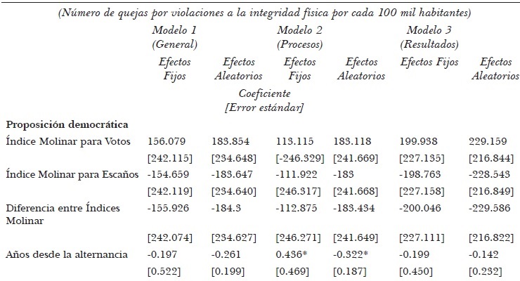 En resumen, los modelos muestran la tensión entre las expectativas teóricas y la dimensión empírica. Retomando a Englehart (2009), las autoridades en las entidades federativas mexicanas pueden ser incapaces de proteger a sus ciudadanos y algunas veces hasta forman parte de los agresores. Dicho de otra forma, los límites entre el poder infraestructural y el despótico (Mann, 2006) llegan a desaparecer en la acción cotidiana de las fuerzas de seguridad locales. ¿Por qué? Una causa plausible radica en la poca utilidad de la democracia electoral para disminuir las violaciones a la integridad física en las entidades mexicanas: si los incentivos electorales para castigar las violaciones a derechos humanos no funcionan, si los controles institucionales no se activan, si el pluripartidismo legislativo no se traduce en controles y sanciones a la violencia arbitraria, queda poco por hacer para erradicar el comportamiento despótico de los agentes de seguridad en las entidades mexicanas.