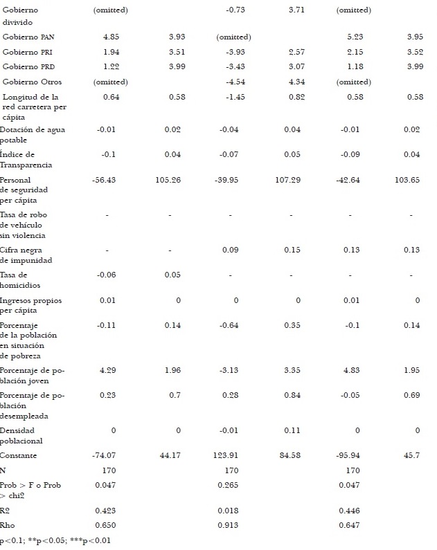 Es claro que la corrupción es uno de los grandes déficits del Estado mexicano, porque merma los recursos para incrementar y sostener su poder infraestructural, además de brindar oportunidades para la cooptación de los funcionarios. Los resultados muestran que el Índice de Transparencia tiene significancia estadística en todos los modelos de efectos aleatorios, con probabilidades de p<0.1 y p<0.05. En ellos, y como se esperaba, el incremento en la transparencia disminuye las violaciones a la integridad física. Desafortunadamente, no hubo disponibilidad de información para utilizar alguna variable de resultados en el área de corrupción.11