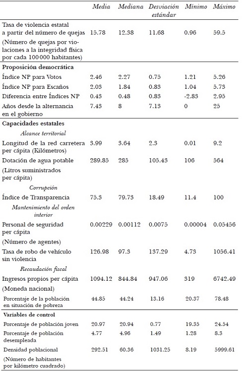 ¿Cuáles son las causas de la violencia estatal en las entidades federativas mexicanas? En términos generales, la hipótesis resultó cierta: el incremento de las capacidades estatales tiene prioridad sobre la democratización electoral para explicar las violaciones a la integridad física. Sin embargo, también hay resultados inesperados. La primera parte de la sección muestra la estadística descriptiva de las variables utilizadas, la segunda presenta los modelos estadísticos con datos panel y la tercera discute los resultados.