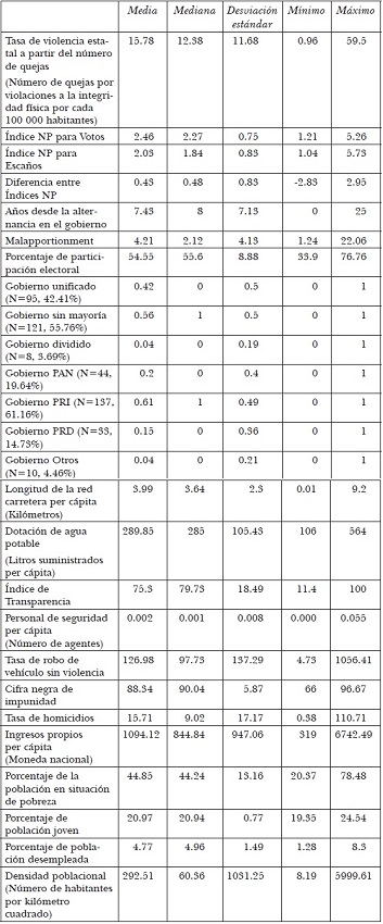 Las variables de la proposición democrática son muy diferentes de una entidad a otra. Por ejemplo, aunque los índices de Juan Molinar (1991) para votos y escaños muestran distribuciones más cercanas al pluripartidismo, es evidente la persistencia de sistemas fuertemente dominados por un partido político. También llama la atención la distribución de la variable años desde la alternancia, porque la literatura afirma que los efectos negativos de la democratización sobre la violencia estatal son más evidentes conforme avanza el tiempo (Richards y Gelleny, 2007; Hill y Jones, 2014).10 En ese sentido, la media de la variable sugiere que siete años es tiempo razonable para disminuir las violaciones a la integridad física. En resumen, la estadística descriptiva de ese grupo de variables refleja la tendencia hacia el pluripartidismo y la alternancia en los regímenes políticos de las entidades mexicanas, aunque también muestra la persistencia de enclaves autoritarios.