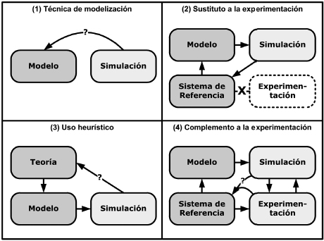 En el primer caso, la simulación es utilizada como técnica de modelización para explorar la dinámica de un modelo. En el segundo caso, la simulación es empleada como sustituto a la experimentación, cuando por razones prácticas y/o éticas no resulta posible diseñar un experimento sobre el sistema real. Si bien éste es uno de los usos más habituales de la simulación, es al mismo tiempo uno de los más críticos, puesto que “mientras en un experimento se controla el objeto real de interés, en una simulación se experimenta con un modelo y un mundo social artificial, no con el fenómeno en sí” (Lozares, 2004: 183). Este uso plantea un problema de doble faz, epistemológico y técnico, relativo a la validación del modelo, esto es, si el modelo implementado es una representación adecuada del fenómeno en el mundo real (David, 2009). El tercer tipo propende a un uso heurístico de la simulación en la cual a partir de una teoría/s se construye un modelo. El objetivo de la simulación es testear o desarrollar hipótesis y/o refinar los supuestos subyacentes al modelo teórico en cuestión. Se trata de un “uso exploratorio [de la simulación] que sirve de apoyo a experimentos mentales” (Treuil et al., 2008: 7). Habitualmente, estos usos se cristalizan en modelos abstractos sobre fenómenos sociales generales que ilustran un argumento o razonamiento teórico, “que no reflejan ninguna instancia empírica concreta y específica” (Squazzoni, 2012: 21). Finalmente, el cuarto tipo de uso consiste en emplear la simulación como complemento a la experimentación. De este modo, el diseño experimental puede servir tanto para validar el modelo de simulación como para la calibración empírica del mismo, con el propósito de desarrollar procesos de inferencia sobre el sistema real.