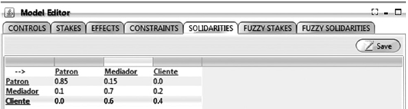 Para modelizar las solidaridades se ha seguido la hipótesis teórica representada en la figura 4 respecto a la estructura jerárquica de las redes clientelares y sus dos niveles de negociación: la relación mediador-cliente y la relación patrón-mediador. Por esta razón, a las relaciones cliente-patrón se les asigna un valor cero en la matriz de solidaridades. Asimismo, se observa que el mediador es el único actor que prodiga solidaridades a todos los actores de la red: con el patrón (0.1), consigo mismo (0.7) y con el cliente (0.2); y recibe solidaridades tanto del patrón (0.15) como del cliente (0.6).