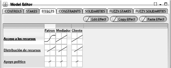 La última fase de la modelización concierne a las funciones de efecto (solapa Effects). El estado de una relación tiene un efecto sobre cada uno de los actores que dependen de dicha relación, puesto que al variar el estado se modifica el grado de accesibilidad a un recurso. Se denomina “saldo” al valor cuantitativo de ese efecto. Para calcular los saldos, se asocia a cada relación y a cada actor una función, denominada función de efecto, que permite calcular un saldo para cada valor del estado de la relación. Al multiplicar los saldos por las apuestas (stakes), se determina el impacto de la relación sobre la capacidad de acción del actor.7 Para todos los actores se ha empleado una función lineal, salvo para la función que corresponde al vínculo “patrón” y “acceso a los recursos”, en la cual se ha representado una función sigmoide (figura 11).